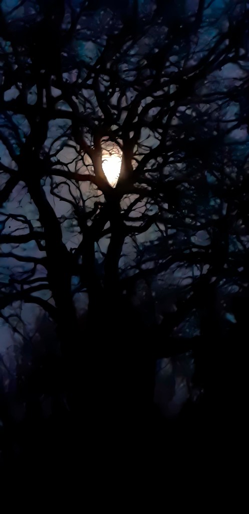 ‘The flutter of breeze upon my skin, a butterfly touch, no more, no less. The rustle of a single leaf and a tremor deep within the earth, wherein lies the truth. I looked up and up into his branches where the moon lay captive within the bonds, the branches formed a prison cell, twigs of wrath appeared to stab the face which gazed so sadly upon my own.